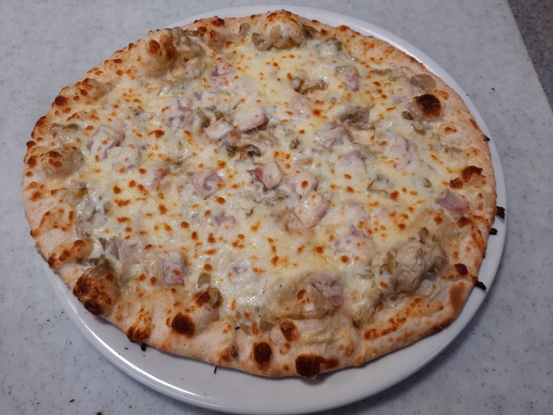 Sauce tomate, mozzarella, jambon, poivrons, oignons, champignons, artichauts.